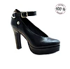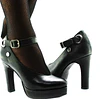 » Lined platform and heel in leather. Ankle strap with silver metal buckle.